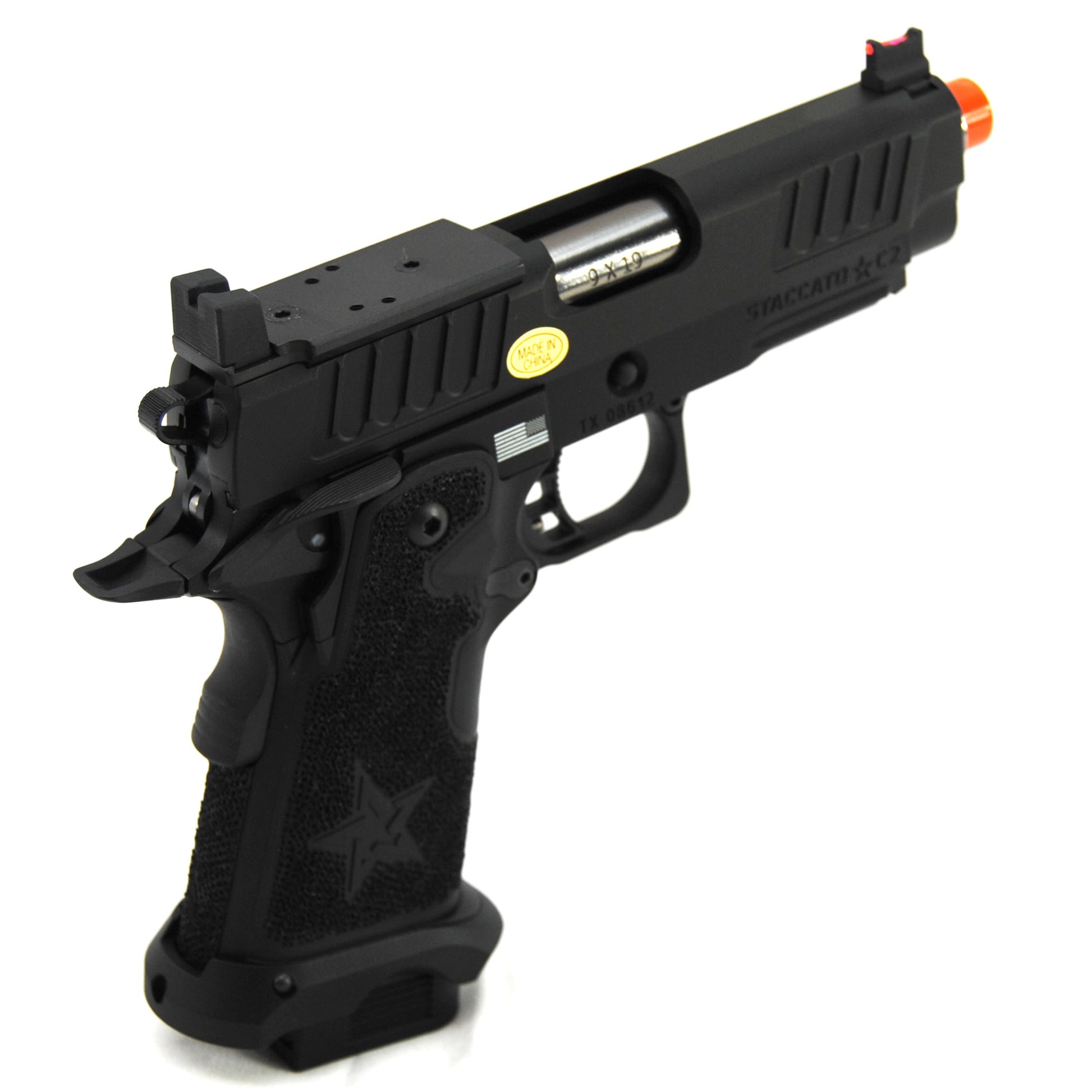 The Staccato C2 has quickly redefined what's possible with a compact carry gun. The C2 is finely crafted with wide serrations at the front and rear of the slide providing superior grip while racking it back, reduced recoil and improved cycling speed. The slide is optics-ready and comes with an RMR pattern plate for the installation of your favorite reflex dot sight. Additionally, the slide comes equipped with a fiber optic front sight and a tall rear sight that allows continued functionality when a reflex dot sight is installed. The C2 metal frame is robust and nicely weighted for a more realistic look and feel and comes with an under barrel accessory rail for your favorite lights or lasers. Preinstalled is a hand-stippled polymer grip which provides a comfortable and secure hold. Other features include a skeletonized trigger and textured trigger guard continuing to provide more stability while firing. The icing on this cake is the authentic licensed logos, patterns and roll marks of Staccato.